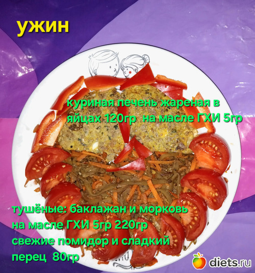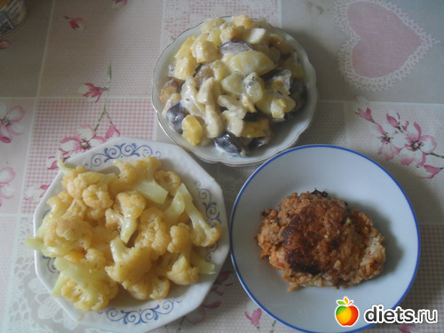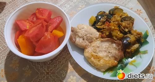 Обед: 120 г куриная отбивная без панировки, 200 г овощное рагу (капуста, кабачки, баклажан, перец, лук, морковь в томатном соке и специях) - надо доедать