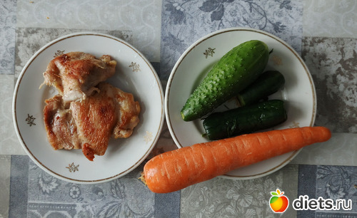 У- куриное филе жареное на масле 2пшика, морковь тертая с 10г сметаны и огурцы св. и св. просольный (всего овощей 250г