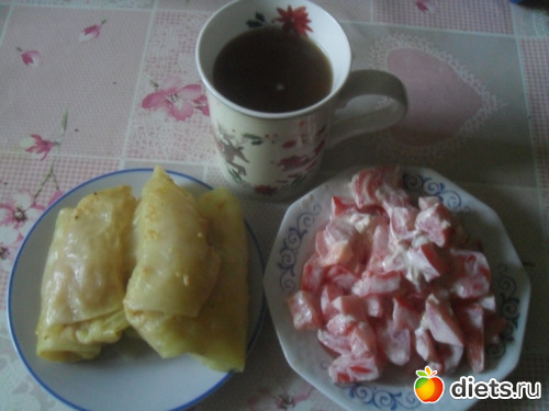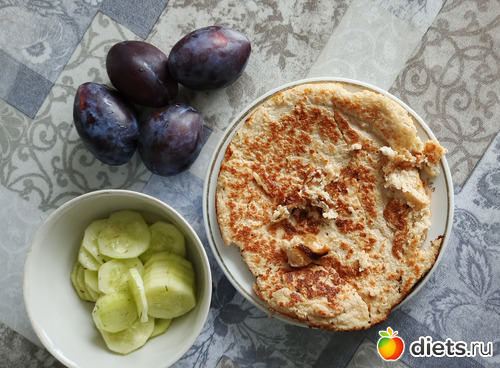З- овсяноблин -40г овсяное отруби, 1 яйцо 50г +70г кефир жарила на 2пшиках масла, огурцы 200г, фрукты -сливы 180г