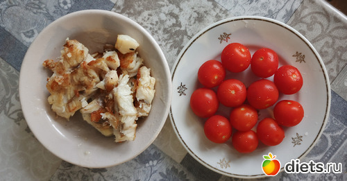 У- треска жареная на 10г раст масла 120г, помидоры 200г