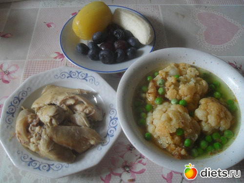 Обед: 120 г курица потушенная на подсолнечном масле с соевым соусом, 200 г борщ без картофеля - гущина, 180 г дыня.