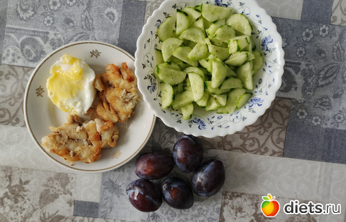 О- треска жареная 70г яйцо запечённое в СВЧ 50г, 200г огурцы св, сливы 180г