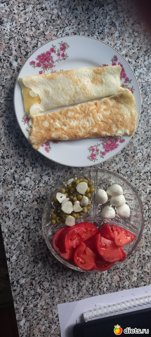 Яичные блинчики с сыром, помидор, горошек, чеснок. Моцарелла к чаю. Лягу спать пораньше, чтобы уже не ужинать, у нас уже 22.00, но организм же он такой, может ужин потребовать, так что лучше я его спать уложу...