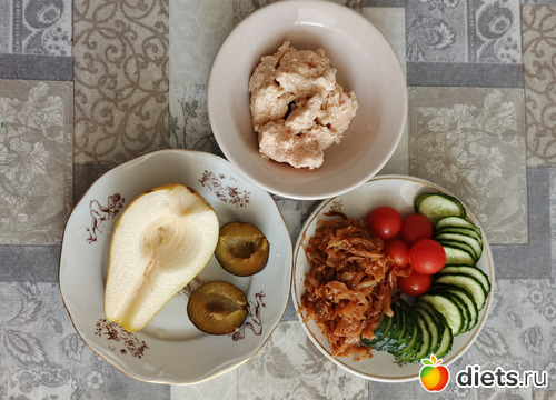 О- тушенка из грудки индейки 120г, тушеная капуста, пом. черри, огурцы -200г, груша и слива -180г