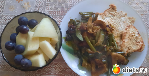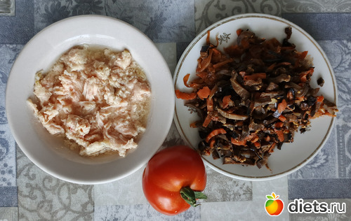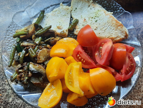 У- тушенка из индейки 120г, тушеная капуста и баклажаны с морковью 150г, помидор 110г