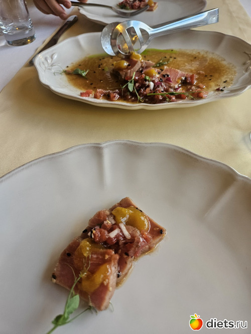 Ужин: какое-то сложное название, забыла... но по факту это тунец в каком-то соусе, сверху оранжевое - манго. Ну просто невероятно вкусно!