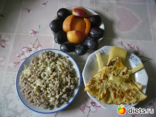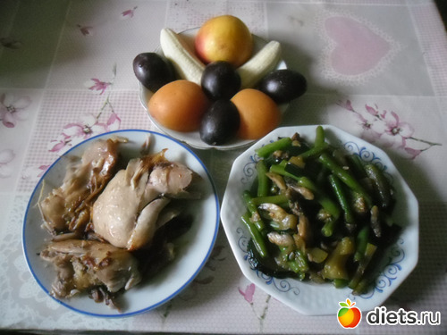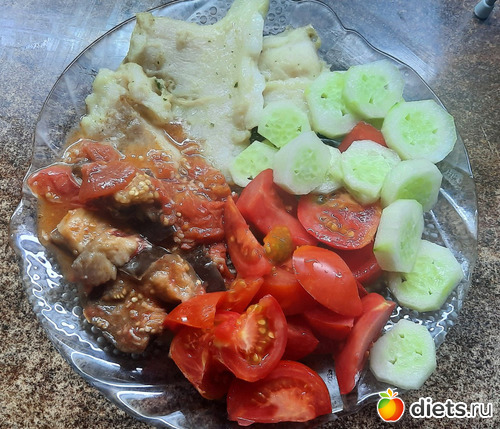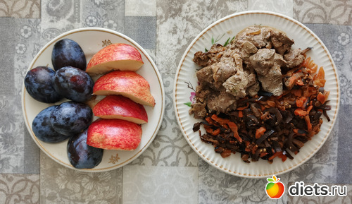 О- печень кур тушеная 120г, капуста тушеная и баклажаны с морковью 250г, фрукты 180г