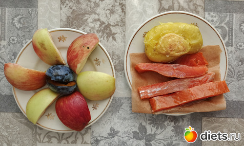 З- форель хол копчения малосольная 120г, картофель 110г, фрукты 180г
