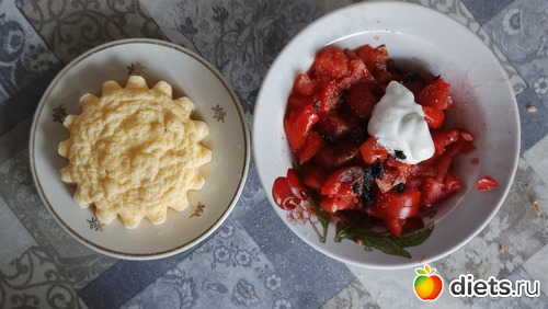 У- запеканка (творог 40г и яйца 90г) 120г, помидоры 200г сметана 20г