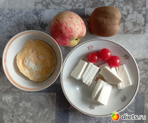 З - очень быстрый 70г творожный сыр, 59г яйцо в СВЧ и фрукты 180г