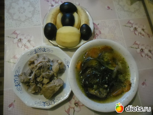 Обед был поздний, суп гороховый 250 г , отварные куриные желудки 80 г, хлеб 40 г, салат из помидор огурца и перца болгарского довольно много.