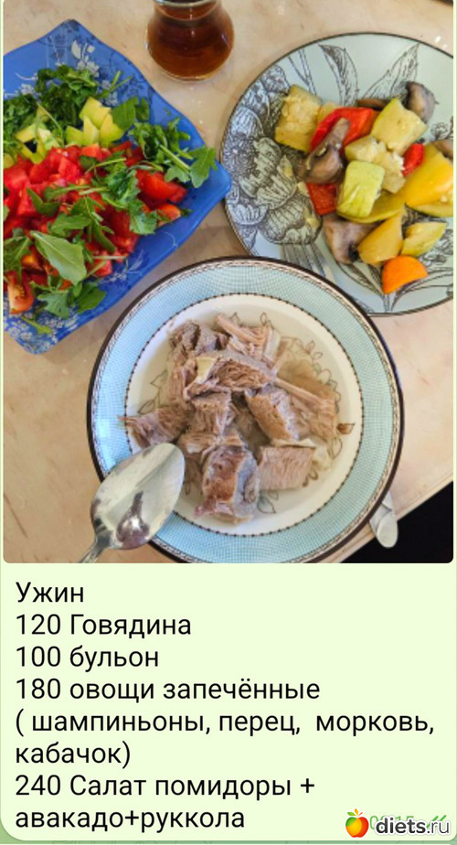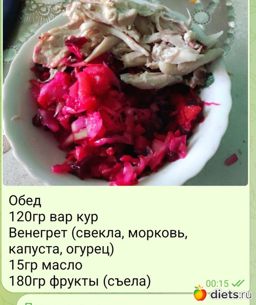 У́ без фото (ужинала не дома) - винегрет 200г без картофеля с зел. горошком, 200г огурцы помидоры и 80г сосисок из индейки(для детей)