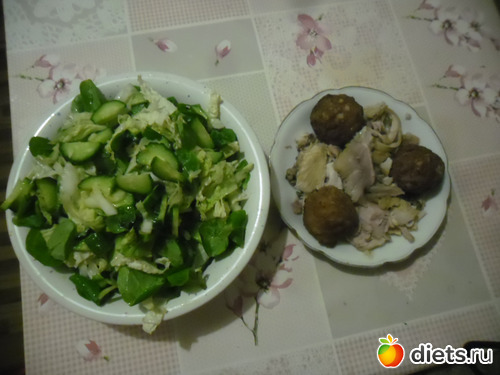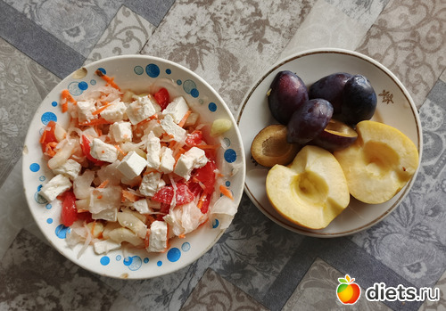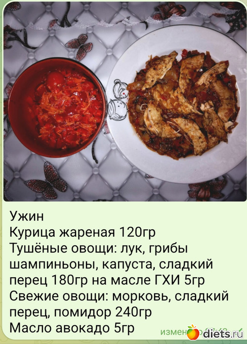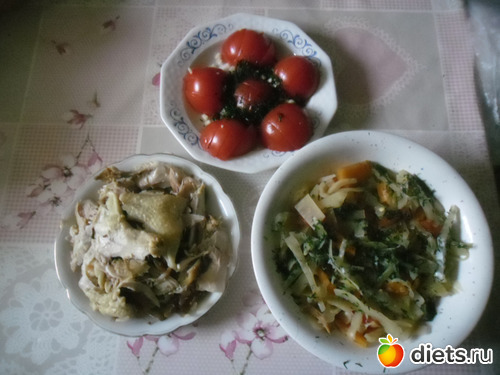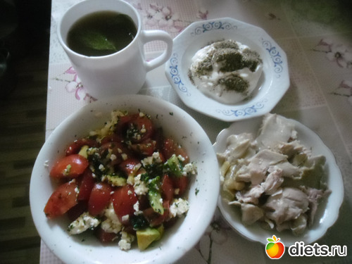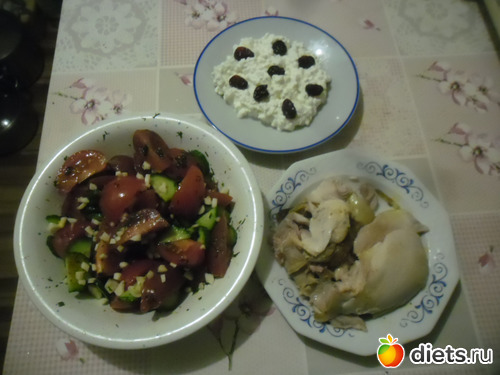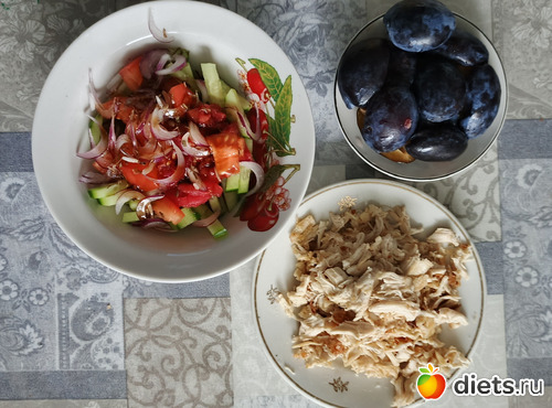О- кур филе вар 120г чуть прижарено с луком на 5г масла ГХИ, салатогурцы помидоры, соев соус и 5г масла с базиликом., сливы 180г