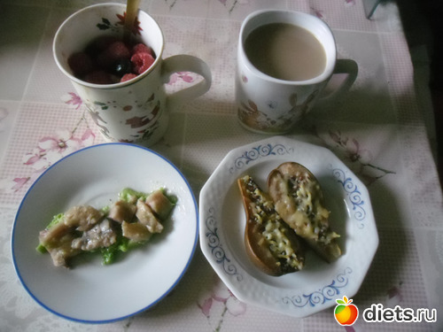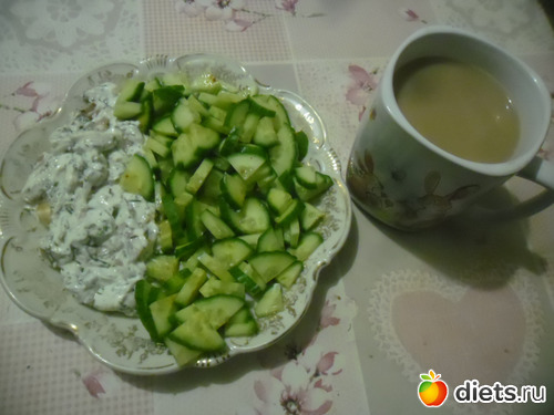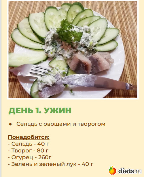 Ужин: Сельдь с овощами и творогом с зеленью. Бокал цикория с молоком.