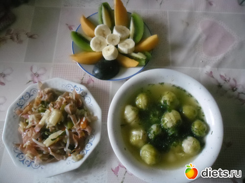 Обед: Суп на курином будьоне с капустой и зеленью, Замороженные овощи с бужениной из курицы, фрукты разные.