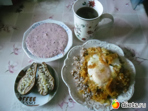 Завтрак:Гречка с луком и морковью и одним яйцом. Творог с замороженными черникой и малиной. Две половинки небольшой груши с семенами и сыром запечённые в духовке и бакал кофе Цикория