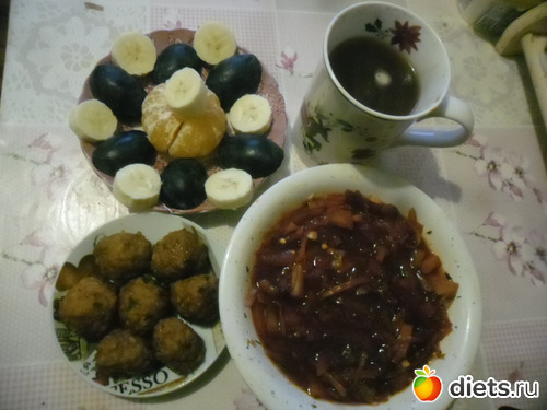 Обед: Борщ, фрикадельки с говядины, банан, слива и небольшой мандарин, бакал кофе "Цикория".