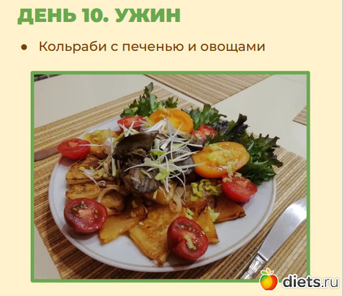Комментарий: Этот вариант ужина- яркая демонстрация того, как можно правильно и полноценно питаться, затрачивая при этом минимум усилий. Приготовив заранее кольраби и печень – мы получаем колоссальную экономию времени, когда во время рабочей недели не хочется стоять у плиты.