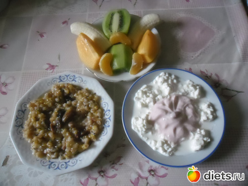 Завтрак:Творог, каша перловая с тыквой и брусникой, фркуты:банан,киви, хурма, мандарин и бакал кофе цикория