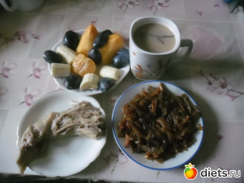 Обед: свиной хвостик, варёные овощи из борща, фрукты: слива, хурма, банан, мандарин и кофе Цикория