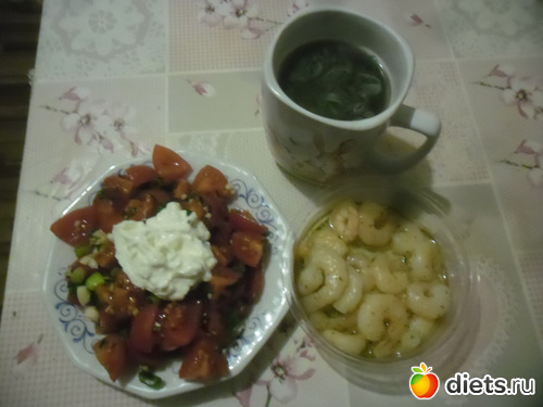 Ужин: салат из томат с зеленью и чесноком, кальмары и бакал кофе Цикория