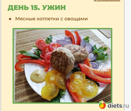 Сделать все это можно заранее - а к ужину просто разогреть. Выложить на тарелку - 120 грамм готовых котлеток. Дополнить тарелочку любимыми свежими овощами, которые моно есть вприкуску с котлетками, и каплей горчицы для усиления вкуса.