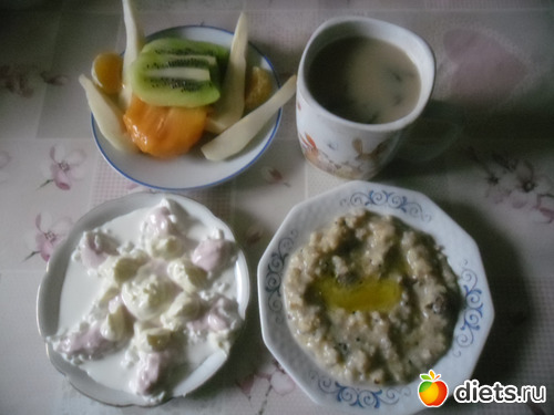 Завтрак: Каша перловая с брусникой и тыквой, творог+йогурт, фрукты: хурма, киви, мандарин,груша и кофе Цикория