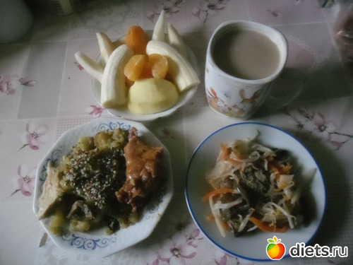 Обед: Мясо, картофель с луком и грибами посыпанный 1 ч л набором семян и орешек молотых, азиатские овощи, фрукты: банан, груша, хурма, мандарин и яблоко и кофе Цикория.