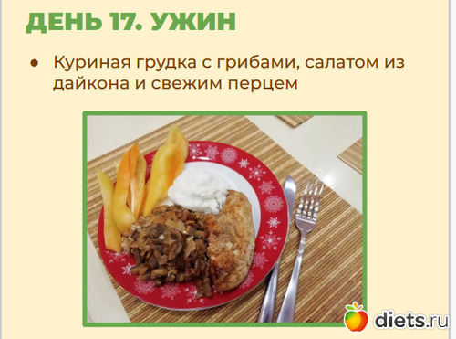 Приготовление: Куриную грудку готовим, как описано в 14м дне. Обжариваем шампиньоны с луком на сковородке.