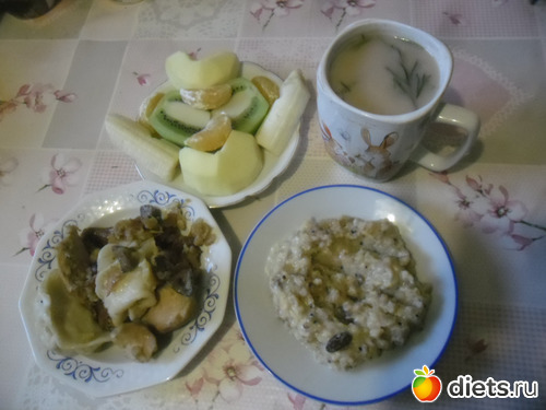 Завтрак: Каша перловая, два вареника с картошкой и картошка с грибами, кофе Цикория с молоком.