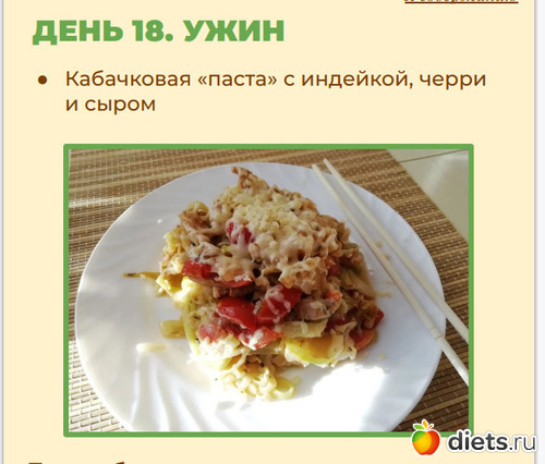 На тарелку выкладываем 170 грамм кабачковой «Пасты», 90 грамм обжаренной грудки индейки и посыпаем сверху тертым пармезаном.