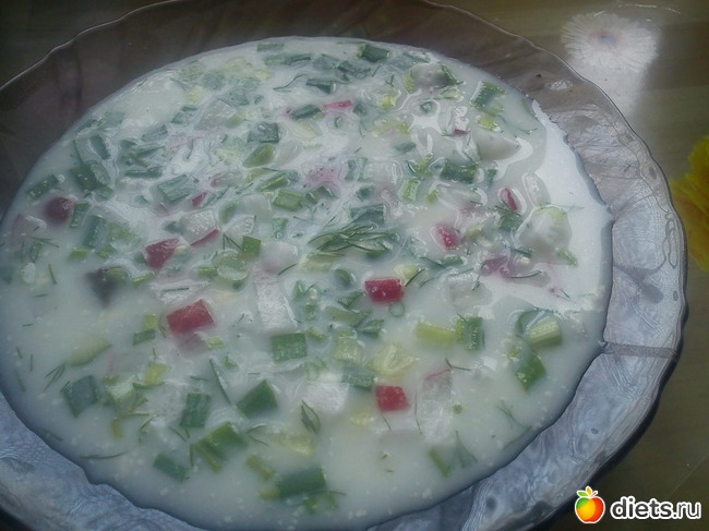 Состав: говядина вар., яйцо вар., редис, огурец, зелень. Заливаю кефир + вода.....чуть чуть уксуса, добавляю горчицу. За уши не оторвать!