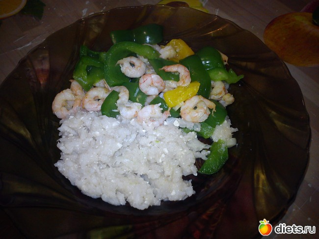 Состав: цветная капуста отваренная в пароварке, толчем как картошку пюре. креветки тушим с перцем.