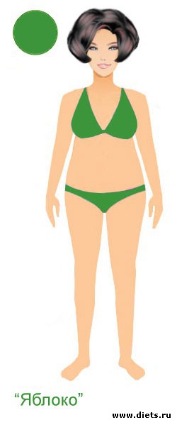 Скорость обмена веществ средняя. Излишки веса распределяются в верхней части тела – руках, плечах, боках и животе, а также на талии. В запущенных случаях фигура начинает напоминать яблоко.