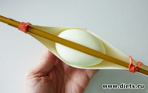 3. Пока яйцо все еще теплое, очистить его от скорлупы, положить на коробку, положить в середину на яйцо палочку и закрепить с обоих концов резиночками.