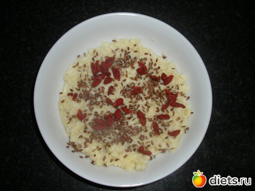 На "второе" - каша пшено на молоке с ягодами Годжи (барбарис по нашему) и семенами льна. Также на завтрак у меня ложка льняного масла и витамины.