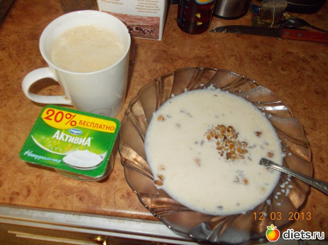 И еще овсяная на воде каша с творогом (сегодня был обезжиренный) ягодами Годжи (барбарис по нашему) и семенами льна. Также на завтрак у меня ложка льняного масла и витамины.