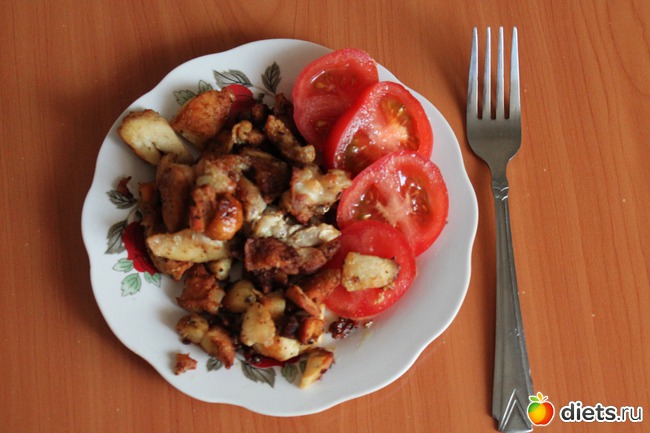 Приветик.это мой завтрак:яичница с куринной грудкой,цукини и помидор,кусочек протеинового хлеба,всего 5,5 у.е