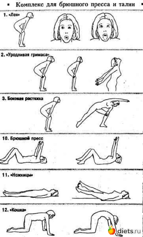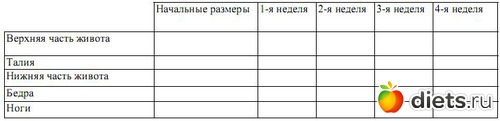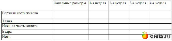 упражнения сразу же, как встанете с постели. Что нужно надевать? Можно оставаться в пижаме, хотя подойдет любая одежда (или ее отсутствие), если вам в ней удобно, если она не препятствует растяжке и наклонам. Не требуется и никакого спортивного оборудования. Вам не нужно расставаться с домом, кошкой, холодильником... И даже если вы предпочитаете заниматься по видеокассетам — с телевизором. Я вас обманула. Вам все-таки понадобится специальное оборудование — измерительная лента. Очень важно наблюдать, как меняется ваша фигура день ото дня. Поэтому до начала занятий измерьте талию, верхнюю часть живота (на пять сантиметров выше талии), нижнюю часть живота (на два с половиной сантиметра ниже пупка), бедра (в области бикини) и ноги (самую широкую часть). Если это возможно, пусть это сделает кто-то из ваших домашних, чтобы цифры были точнее. В течение одного—семи дней, если вы будете выполнять все правильно, ваш объем значительно снизится. Именно в средней части, которая является самой проблемной зоной и для женщин, и для мужчин. Записывайте свои размеры на протяжении месяца, не чаще, чем раз в неделю. (Если перед менструацией у вас увеличивается живот, отметьте, потому что это повлияет на результаты измерений и вы не сможете определить, сколько сантиметров на самом деле потеряли.) Приступая к программе, сделайте первое измерение, а затем измеряйте себя каждые семь дней. Вы скоро убедитесь, что начали худеть. Разве это не стоящая награда?