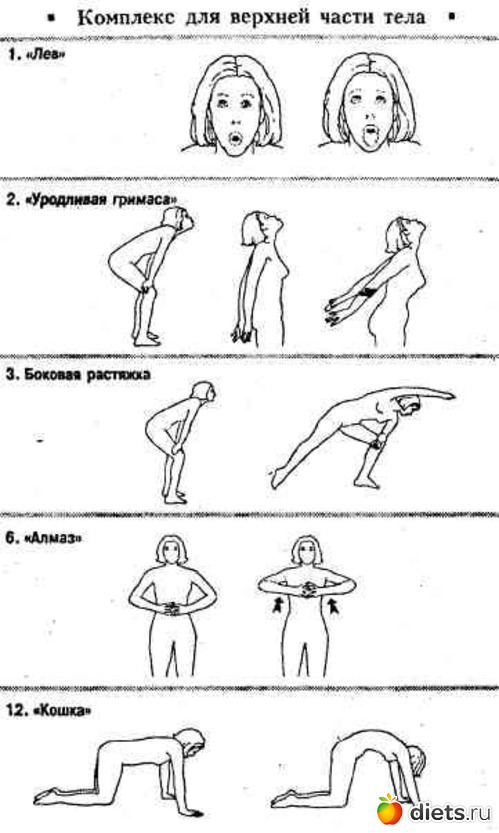 губ вниз (напрягая щеки и носовую область) и высуньте язык до предела (это работает на область под подбородком и шею), не расслабляя губ. Выдержите эту позу на восемь счетов. Поза выполняется пять раз.