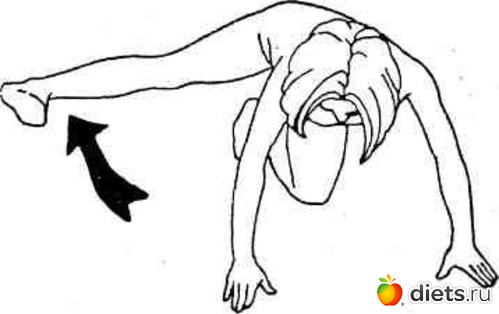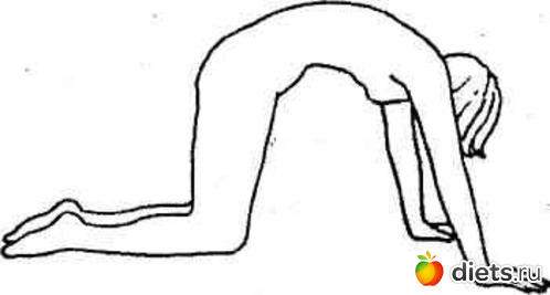 Основная поза: держа руки прямыми, вытяните их вверх, в то же время поднимая плечи и отрываясь от пола. Голова должна быть откинута назад. Смотрите на воображаемую точку на потолке позади себя. Постарайтесь как можно больше оторваться от пола. Пусть плечи и грудь поднимутся как можно выше. Теперь опуститесь на пол — сначала нижнюю часть спины, потом плечи, а затем голову. Как только голова коснулась пола, тут же снова поднимайтесь. Голова должна оставаться откинутой назад. Руки поднимите вверх. Подтянитесь вверх и задержитесь в этом положении на 8—10 счетов. Выполните упражнение три раза.