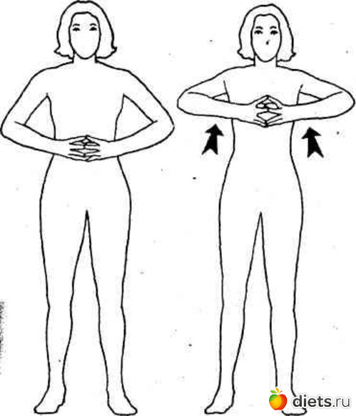 Начальная поза: станьте прямо, ноги на ширине плеч, замкните руки в круг перед собой. Локти держите высоко, вытянутые пальцы сомкните. Немного округлите спину, чтобы удерживать локти вверху, но руки должны касаться одна с другой только пальцами, а не ладонями. Выполните