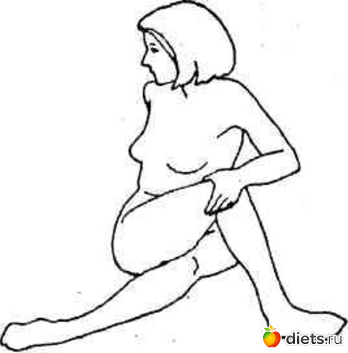 Основная поза - вес приходится на левую руку. Правой рукой подтяните левое колено вверх и к себе как можно ближе, а туловище сгибайте в талии влево, пока не сможете посмотреть назад. Вы должны почувствовать, как растягиваются мышцы наружной поверхности бедра и талии. Задержитесь в этом положении на восемь—десять счетов. Выдохните и начните заново. Выполните это упражнение три раза с левой ногой сверху и три раза с правой ногой, чтобы правая рука была сзади, правое колено подтягивалось левой рукой, а вы поворачивались вправо.