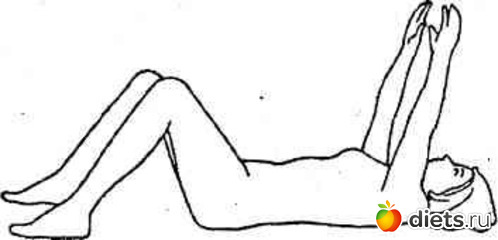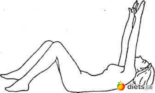 Начальная поза: лягте на спину, выпрямите ноги. Теперь поднимите ноги так, чтобы колени были согнуты, а ступни стояли на полу на расстоянии 30—35 сантиметров друг от друга. Потянитесь руками вверх, к небу. Голову не открывайте от пола. Выполните дыхательное упражнение, втяните живот и