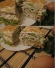 Сверху снова выкладываем омлет+салатный лист+мелко порезанная грудка+ смазываем творогом и так продолжаем пока не закончатся омлеты.