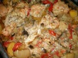 Курицу режем на среднего размера кусочки, 3-4 баклажана, 2-3 луковицы, 5-6 помидоров, 4-5 сладких перцев, 5-6 картофелин режем вдоль - на дольки. Все складываем в миску, добавляем соль и разные специи - перец, кумин (зира), по чуть-чуть кардамона и корицы, соль - по вкусу. Добавляем 4 ст.л. майонеза, 4-5 ст.л. раст. масла, перемешиваем, выкладываем в форму для запекания и в духовку примерно на 1 час. Перед подачей посыпать зеленью.