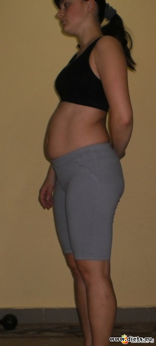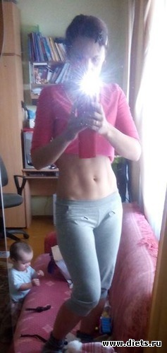 И конечно же спорт. Вначале занималась понемногу, постепенно подбирая и добавляя упражнения в свои тренировки. Занималась в то время, когда крошка спала или же занималась вместе с ней - это не так сложно, а наоборот весело и польза не только для мамы, но и для малыша. У малыша тоже таким образом тренируются мышцы и ещё вестибулярный аппарат. Так что от таких тренировок двойная польза. Так прошло месяцев 10 и я пришла ещё в лучшую форму, чем до беременности (это фото в красной кофточке), хотя вес был 59-60 кг. Потом пошла в тренажёрку. Занималась три раза в неделю по часу сама без тренера (у нас его там нету). Так прошло пол года. С начала зимы начала два раза в неделю ходить на фитнес. И с начала марта бегаю по утрам минут по 20-25 и потом немного упражнений на турниках для ног, ягодиц, рук, груди и пресса.