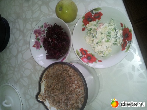 Вот что у меня на данный момент в холодильнике. Отварила гречки мне ее наверно на пару дней хватит сварила сразу побольше так как работаю и на работу бегу и салатики. Со свеклой и черемшой и творог с огурцом и помидоров сегодня увы без мяса. Т. К творог это белок как и мясо. Завтра возму на работу гречку сделаю салатик с покинской капустой и может куплю кусочек сыра или томатного сока чтоб по вкуснее было. Это получается сбалонсированное бжу.