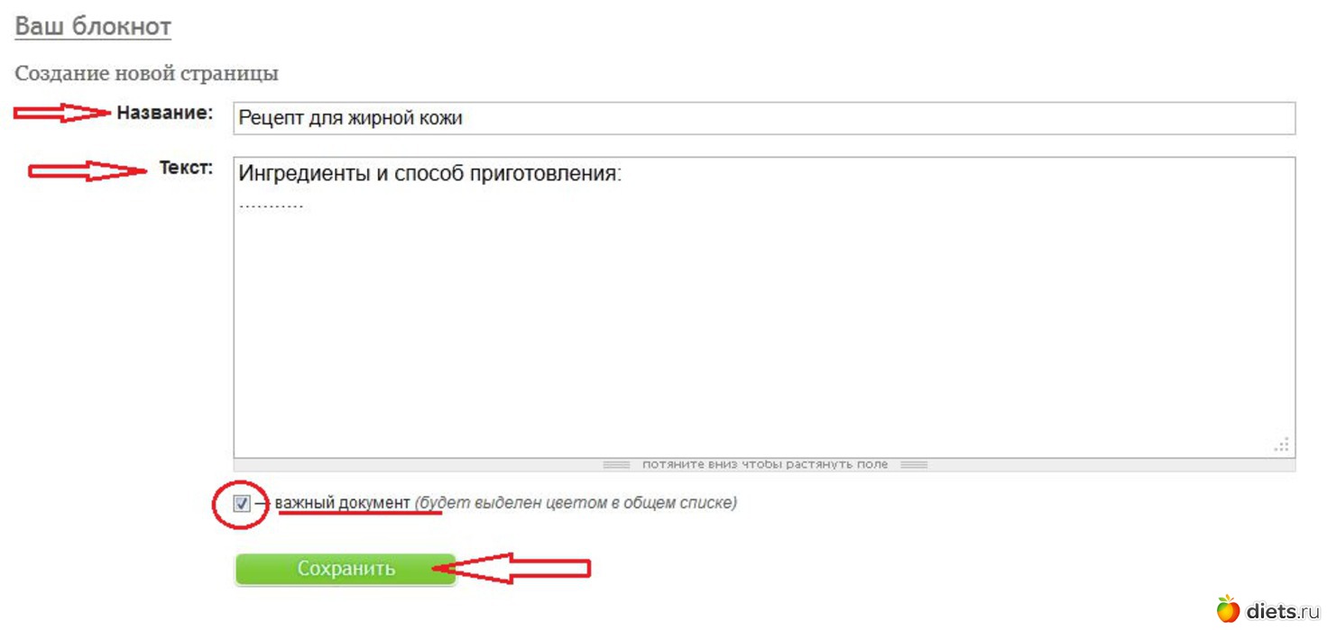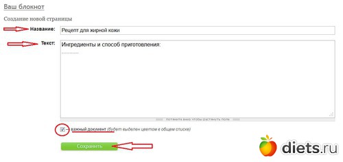 4. Создать страничку блокнота, заполнив поля "Название" и "Текст". Отметить при необходимости важность документа галочкой в квадратике, расположенном напротив строки "Важный документ". Нажать на кнопку "Сохранить"