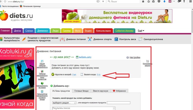 Ссылка на ваш дневник питания расположена в колонке слева, в меню «Центр управления похудением». Кликнув на нее, мы попадаем вот в такую форму: